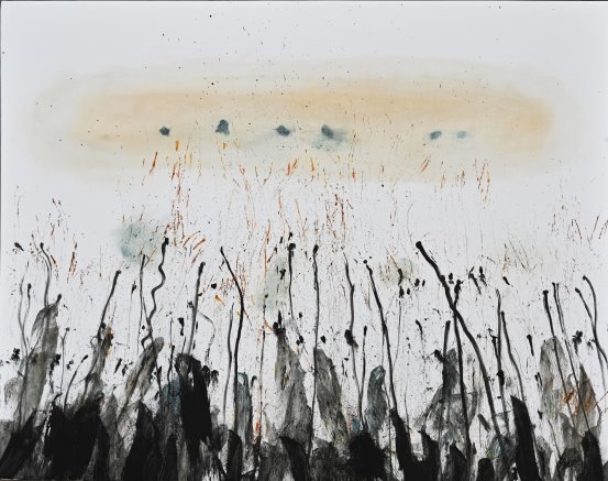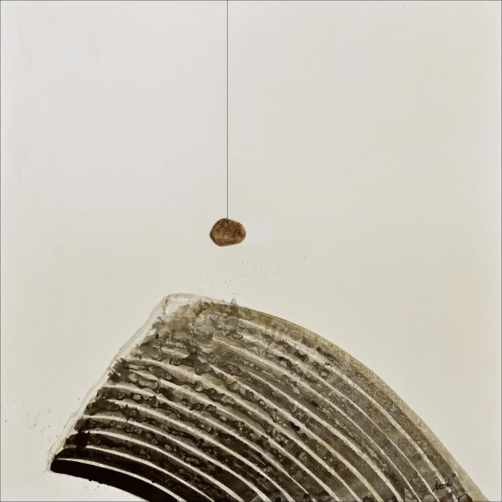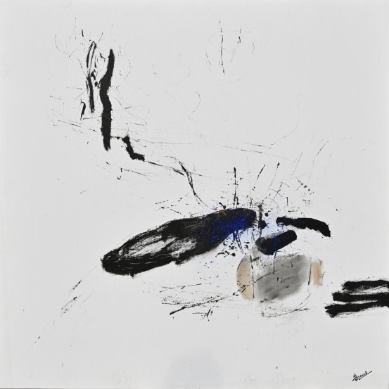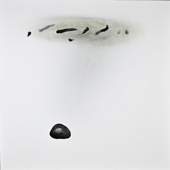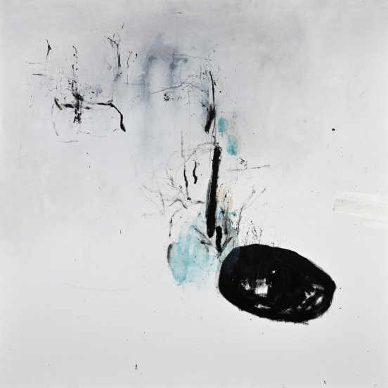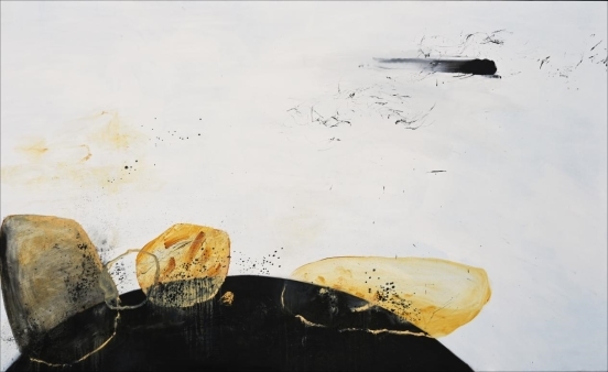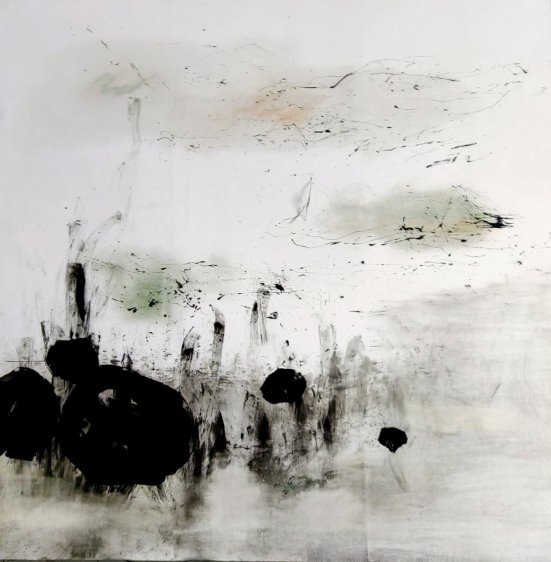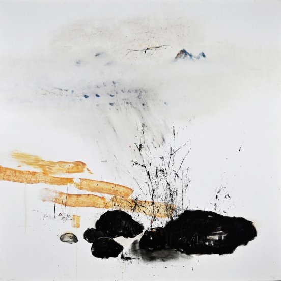 近年来,张琪凯的绘画形式语言呈现出 "介于具象和抽象之间"的特征,表达方式既保留了西方抽象表现主义的视觉张力,又延续了东方审美的韵律与意境。通过对山石意象的抽象化处理,展现了其对东方山水美学的独特理解。这种“象与不象”的抽象化处理并非简单的形式简化,而是通过笔墨的浓淡虚实变化,营造出 "气" 与 "烟雨" 的朦胧感觉,体现了东方美学中 "意象" 的表达方式。作品中反复出现的石头、枯枝、树影等自然意象,并非写实描绘,这种处理让自然意象脱离了“写生”的桎梏,成为绘画语言的一部分,他以枯笔、泼洒、刮擦、厚涂等多元技法,让画面产生“触手可及”的质感:如《春月》《秋水》《生机》等作品中,黑色线条似枯枝生长,笔触的“断”与“连”传递出生命的张力;这种肌理实验既继承了西方抽象表现主义的“行动绘画”内核,又融入了中国水墨“皴擦点染”的笔法逻辑。