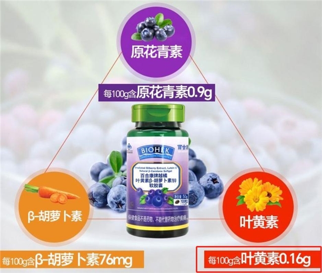 每100克含叶黄素520毫克,添加蓝莓提取物与B族维生素。蓝莓提取物富含花青素,可改善眼底循环;B族维生素能缓解眼部疲劳,与叶黄素搭配,护眼效果更均衡。原料选用新鲜优质万寿菊与蓝莓,经科学提取,留住丰富有效成分。